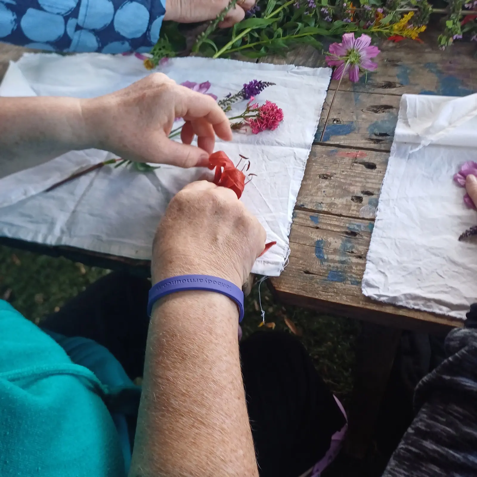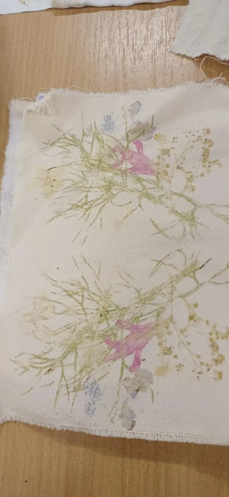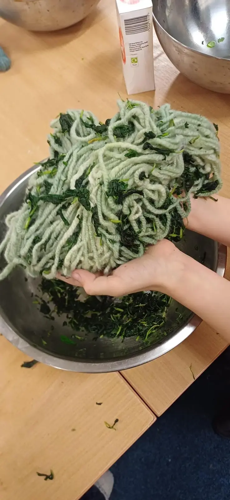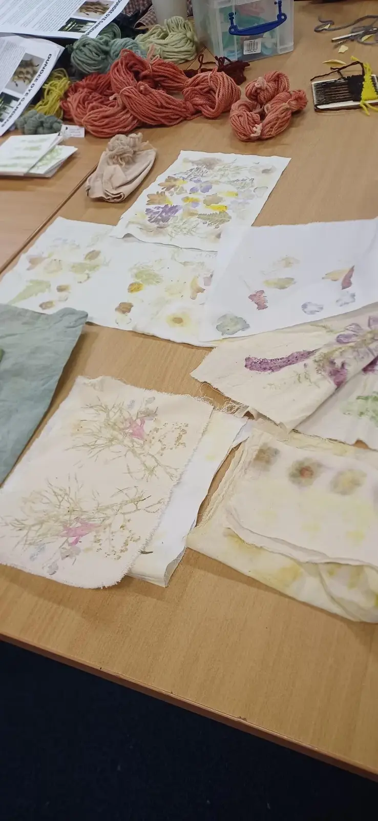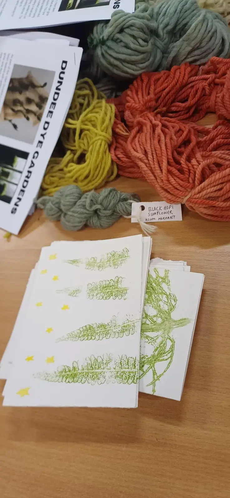 We used some of the dyes to dye wool and cotton fabric. We made cards using Hapa zome (Leaf Dye) which is the Japanese art of hammering the colour out of a plant onto card or fabric.