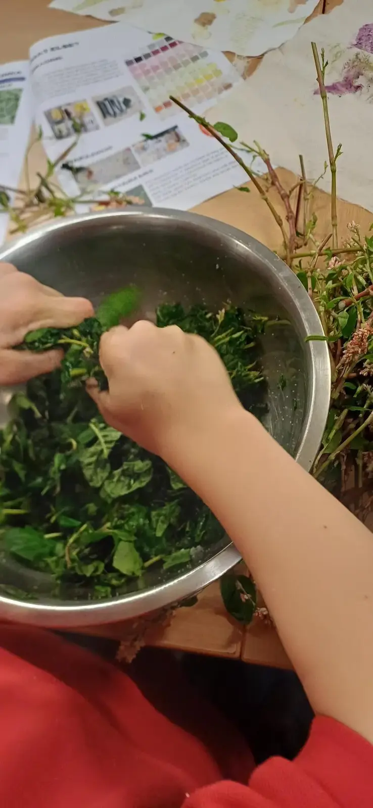 LEAVES- The Indigo leaves give off a blueish tinge even before they are used. In its simplest form we just crushed the leaves by hand in a bowl with water and a couple of table spoons of salt to help the process. There is lots of information online about natural dyeing processes in more detail.