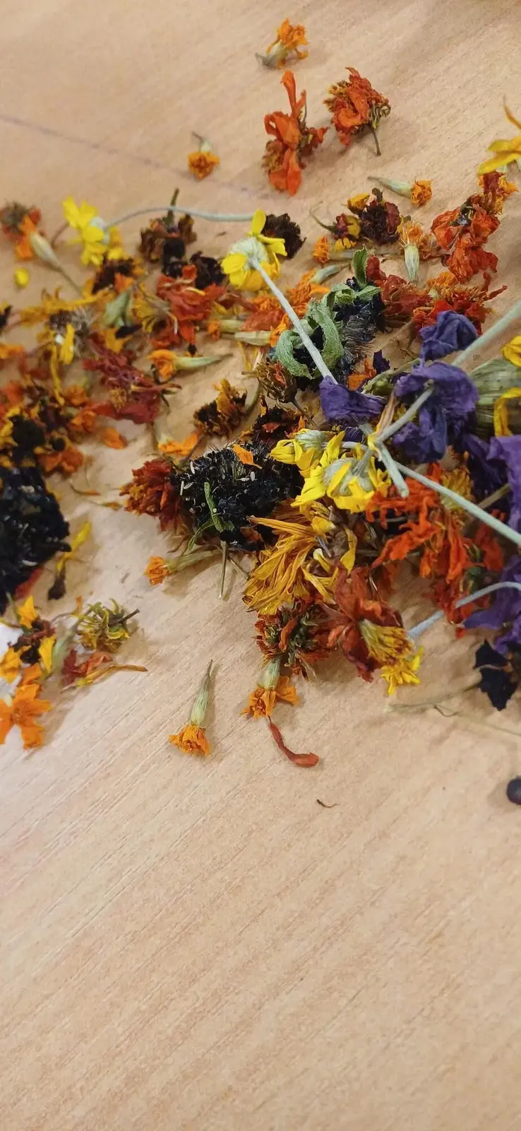 FLOWERS- Marigolds, Stock, Cosmos, Coreopsis, Scabious, Chamomile and Hollyhock flowers were all picked and dried. To dry them they were placed in a single layer on a dry surface. We used a combination of cardboard boxes and wicker trays. On sunny days the flowers were placed outside, we also had some on sunny windowsills. You could use a dehydrator for quicker results. The fully dry flowers were stored in paper bags in a dry, dark place.