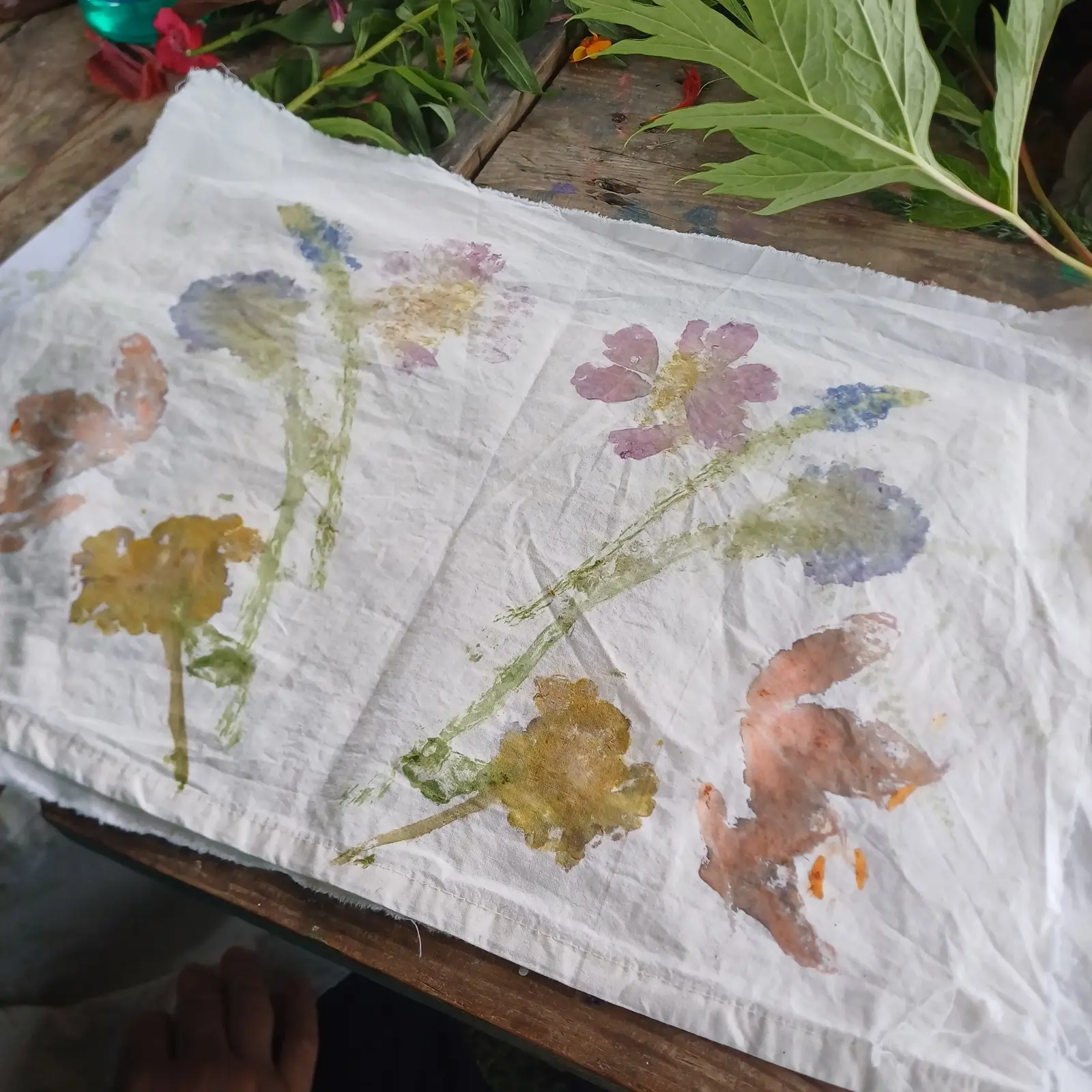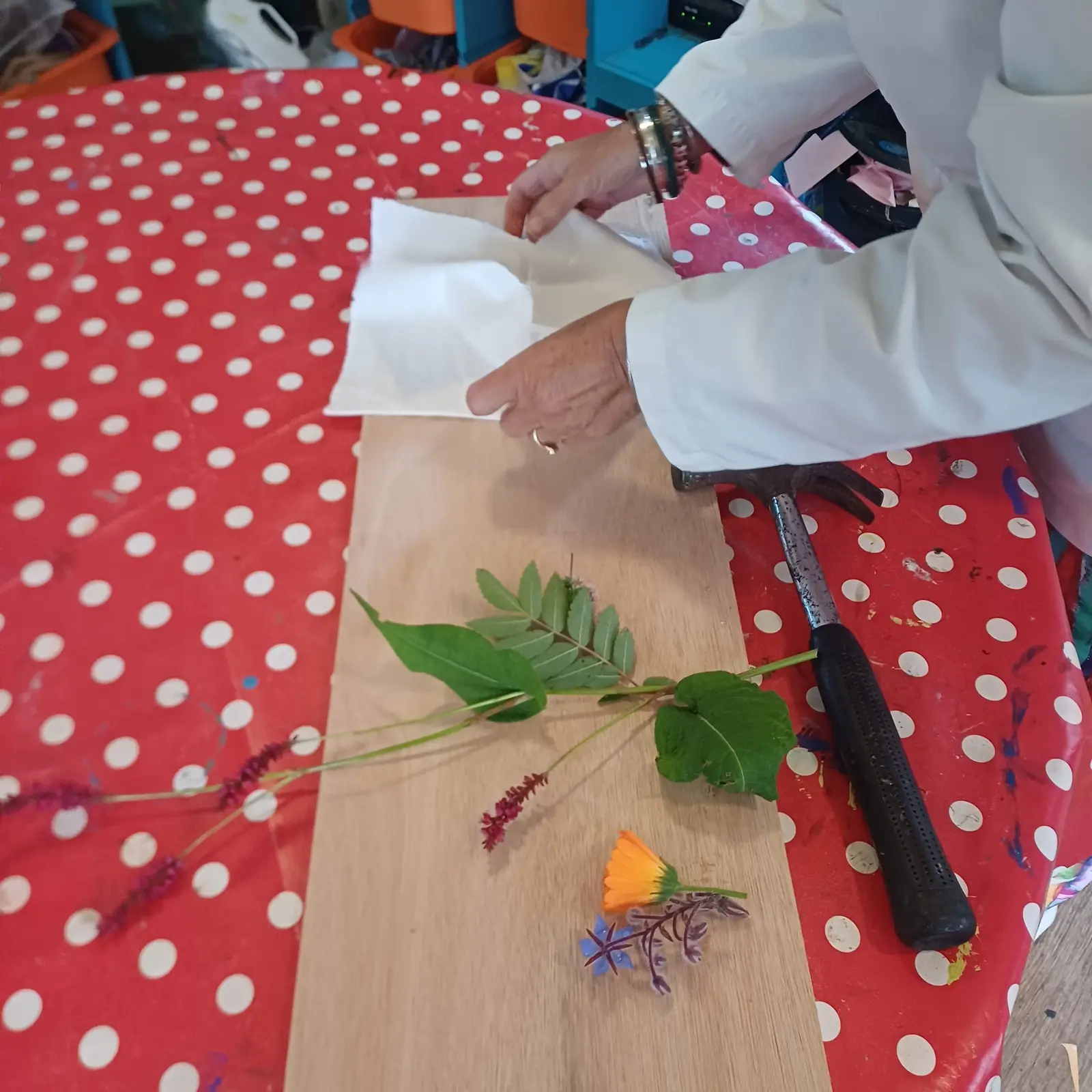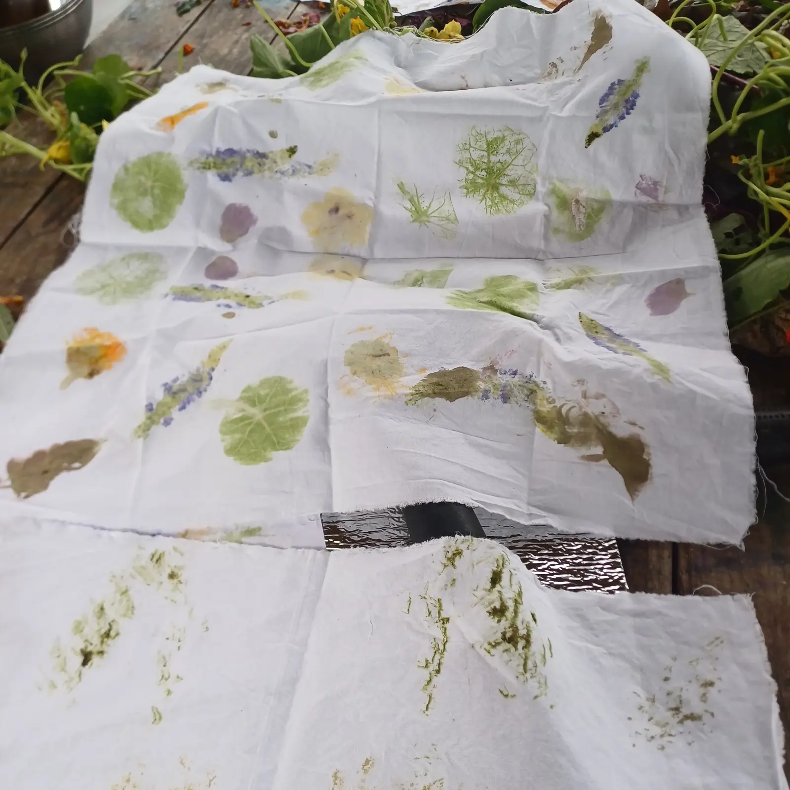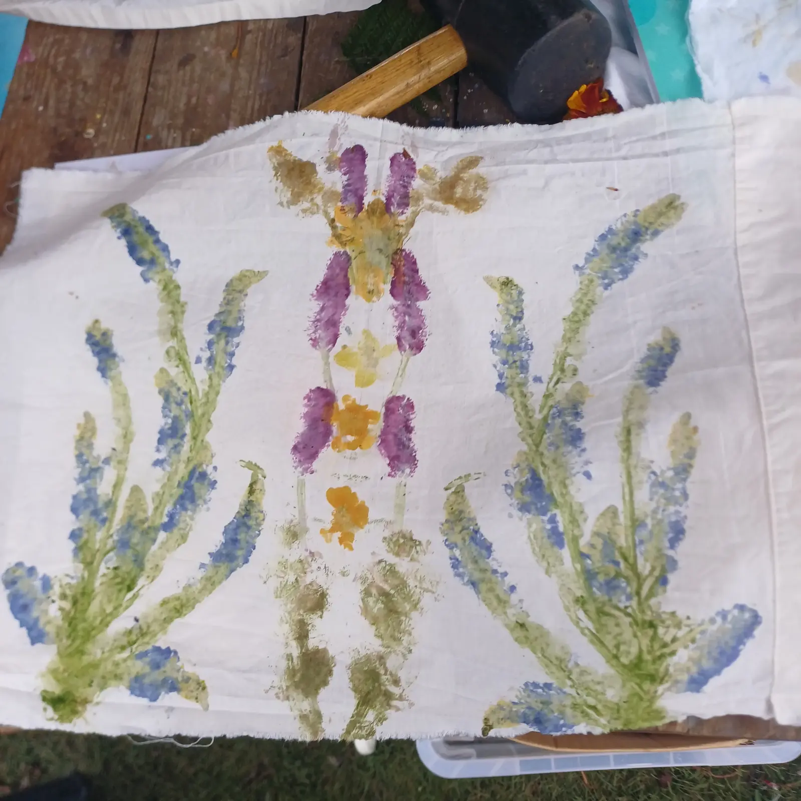 We used clean white cotton squares and laid out the leaves and flowers as flat as possible. We then folded the cotton over with the flowers inside and hammered them....a lot! Sorry neighbours! After a few minutes you can see the flower and leaf prints coming through. It's best to try a few samples to see how it works then you can move on to something a bit more permanent. Carefully ironing the cloth afterwards helps to fix the colours.